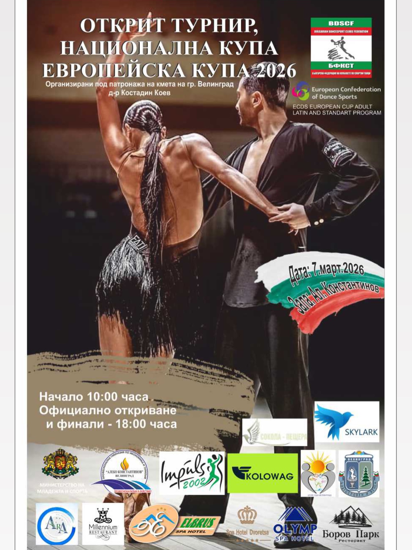 Турнирът по спортни танци „Dance & Spa” Велинград тази година ще се проведе за десети път. Организацията на красивото състезание е общо дело на Българската федерация на клубовете по спортни танци, ECDS, Министерство на младежта и спорта, Община Велинград, Клуб по спортни танци „Импулс - Велинград 2002” и Общинския детски комплекс - Велинград.