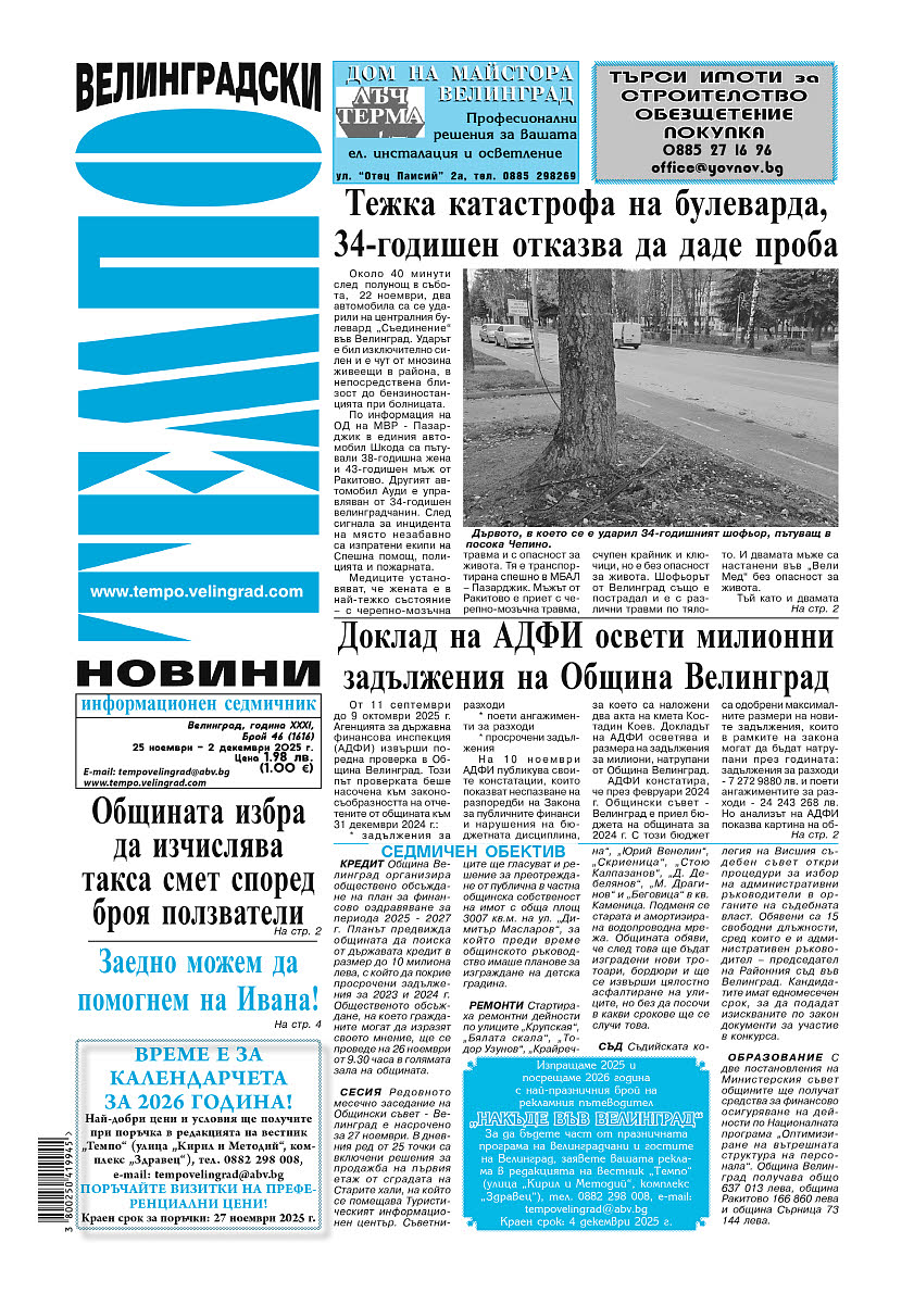 От 11 септември до 9 октомври 2025 г. Агенцията за държавна финансова инспекция (АДФИ) извърши поредна проверка в Община Велинград. Този път проверката беше насочена към законосъобразността на отчетените от общината към 31 декември 2024 г.: