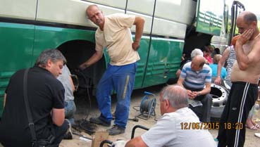 От фирмата превозвач на г-н Беев водачите получиха нареждане да се справят сами на място. Наличните инструменти се свеждаха до няколко гаечни ключа и един подбит секач. Шофьор на ТИР от Пловдив ни остави крика си и беше единственият, който спря, за да окаже някаква помощ. След позвъняване на редица телефони, започвайки със 112, се оказа че най-близката пътна помощ за тежкотоварни автомобили е в гр. Варна и не се ангажира да дойде толкова далеч. Развиването на четири болта с наличните инструменти отне на водачите четири часа и им струваше много пот и кървави мазоли по ръцете, но остана един болт, който трябваше да се среже, за да бъде изваден. Когато се свързахме с фирмата във Велинград с искане да бъде изпратен друг автобус, с който да продължим пътуването си, получихме отказ, а телефоните на ръководителите бяха изключени и на линия остана жената от касата на автогарата.
