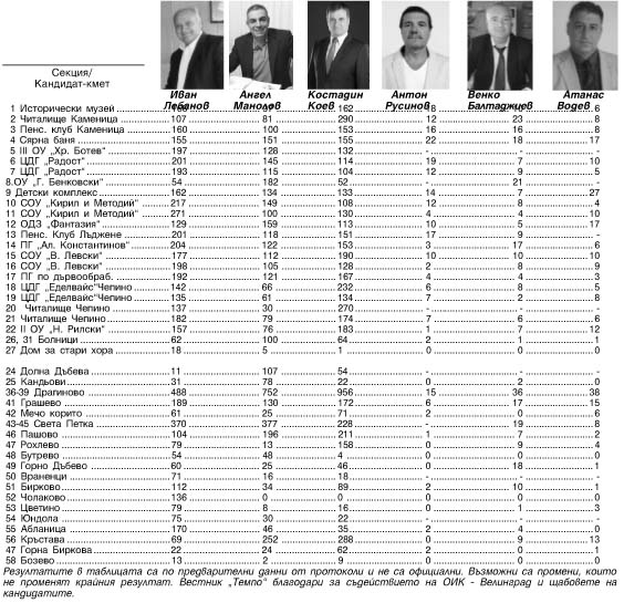 В оспорваната кметска битка след първия тур води независимият кандидат Иван Лебанов, който в борбата си за трети пореден мандат спечели доверието на 6023 избиратели - 34.16%. С малка разлика от 66 гласа на втора позиция е кандидатът на ГЕРБ Костадин Коев с 33.79%. Двамата отиват на балотаж тази неделя, 1 ноември 2015 г.