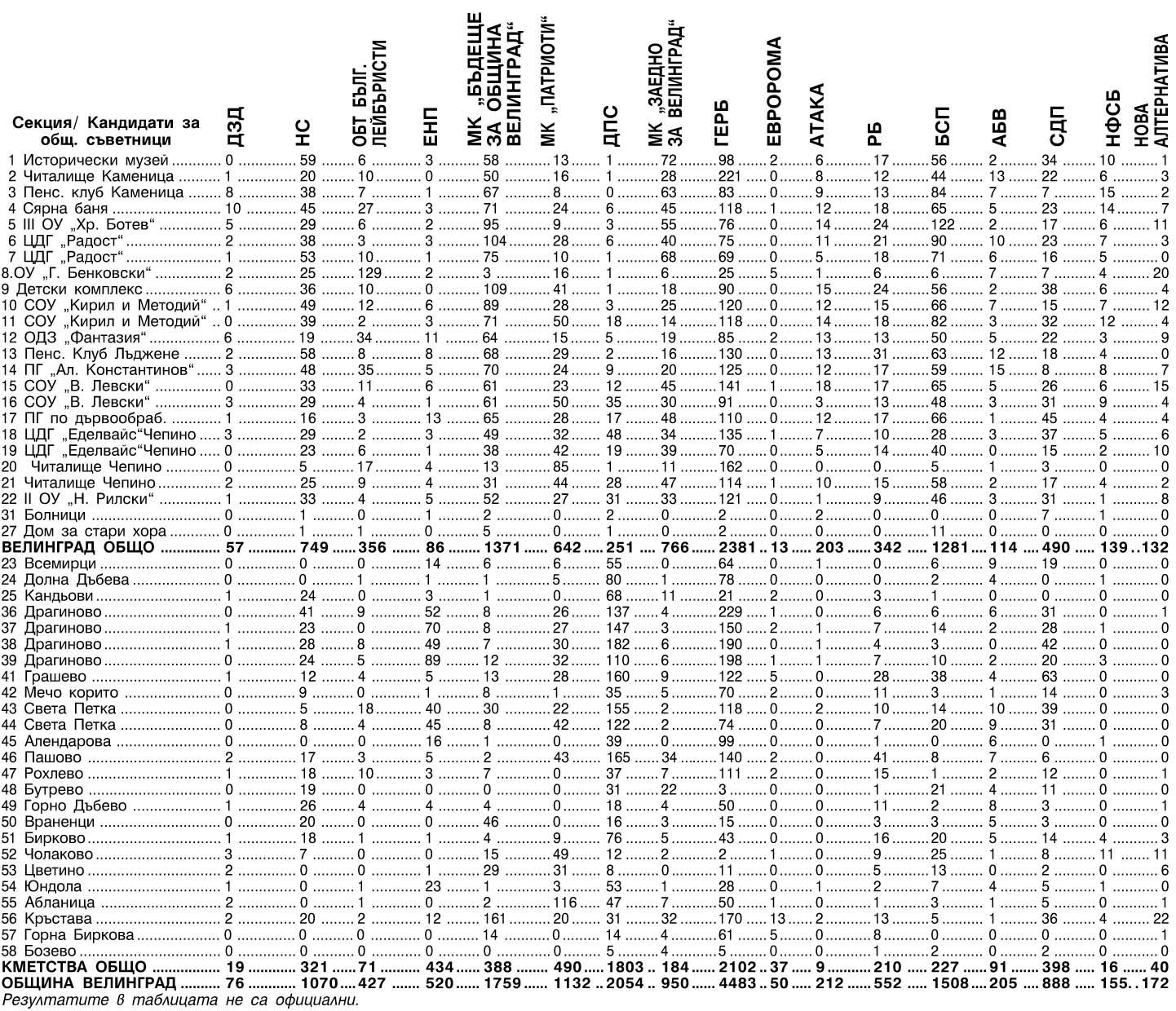 В таблицата ясно се вижда разпределението на гласовете по секции (резултатите не са официални). Видимо е, че този път избирателите в кметствата не са дали традиционната масова подкрепа за ДПС. За първи път ДПС губи от ГЕРБ на собствен терен, а и доста други участници са са успели да получат гласове в отделни селища - например МК “Патриоти” в Абланица или СДП в Грашево.