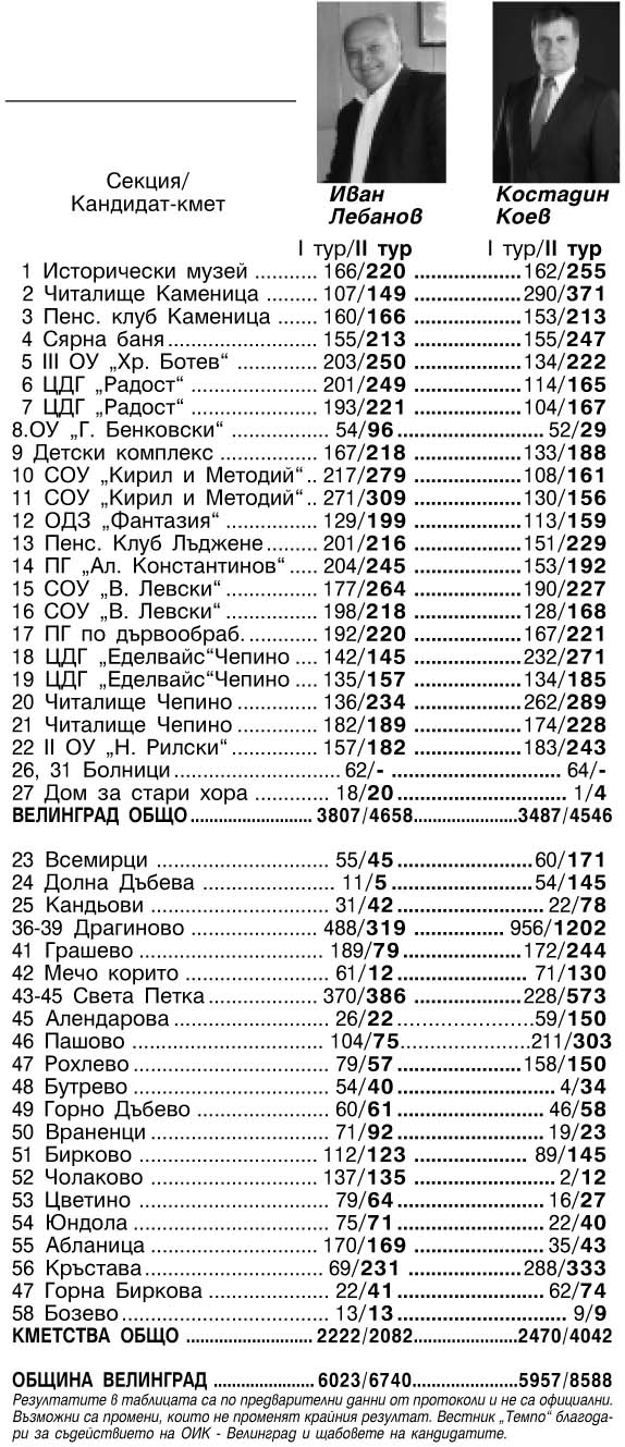 Крайният резултат от кметската битка е 8588 гласа или 56.03% за Костадин Коев и 6740 гласа или 43.97% за Иван Лебанов. В секциите във Велинград вота печели досегашният кмет Иван Лебанов с подкрепата на 4658 избиратели, а Костадин Коев получава 4546 гласа. Везните наклони гласуването в кметствата, където за Иван Лебанов гласуваха 2082, а за Костадин Коев почти двойно повече - 4042 избиратели. (Подробности за гласуването по секции представяме в таблицата).