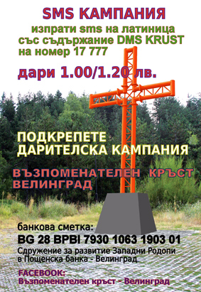 Скъпи съграждани, с радост искам да Ви съобщя, че започнахме есемес кампанията за набиране на средства за Възпоменателен кръст Велинград. Тя, разбира се, върви паралелно с кампанията, която започнахме през месец октомври миналата година.