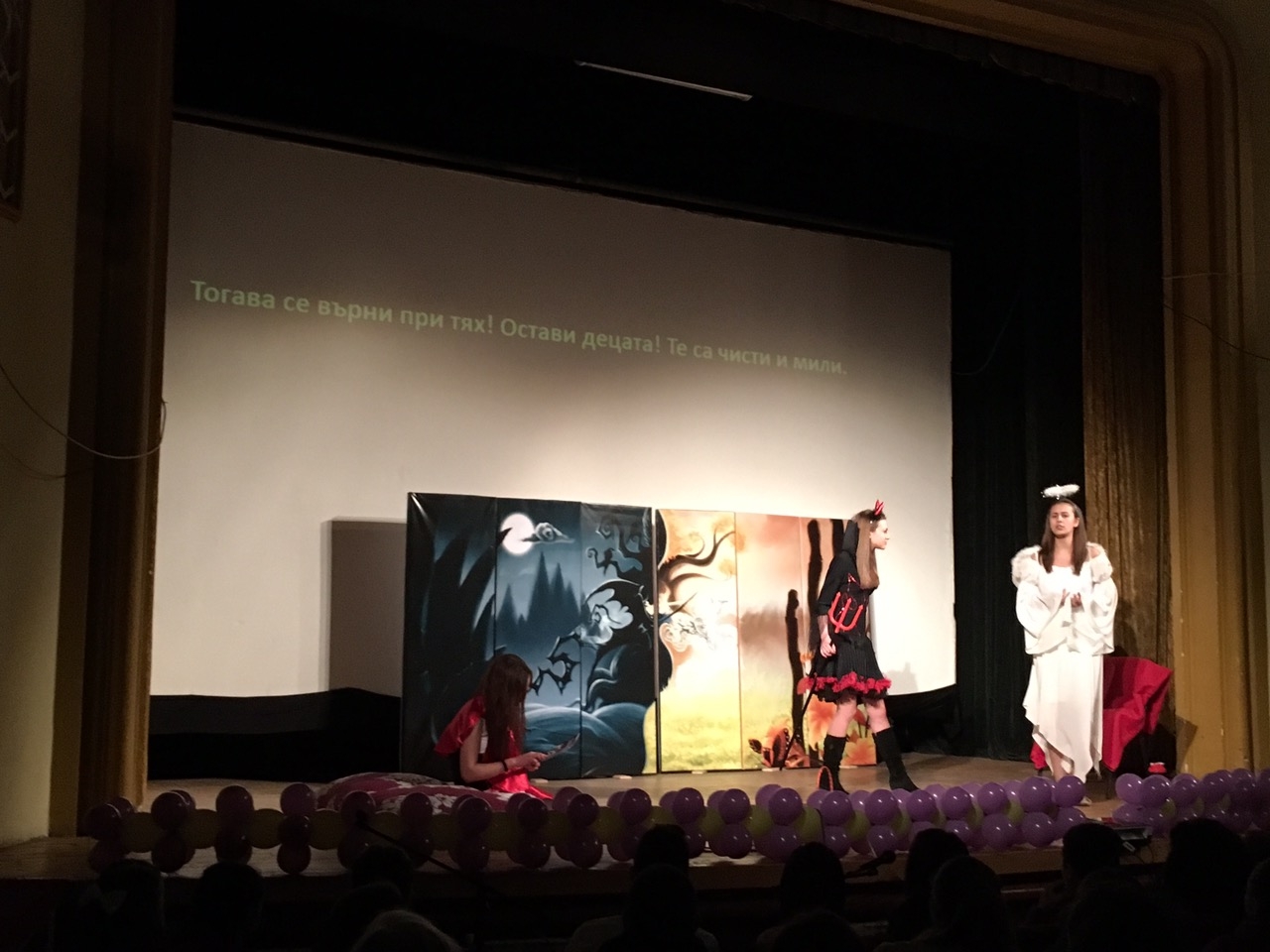 Вечерта на 10 май бе посветена на театралното изкуство. На сцената на НЧ “Отец Паисий-1893” се изявиха възпитаници на езиковите паралелки - с постановки на немски и английски език и поетичен рецитал на руски език. В навечерието на празника дойде новината, че създаденият от ученици филм “Червената шапчица” - съвременна трактовка на известната приказка, заснет на HD формат с мобилен телефон, е отличен със специален диплом като най-добър задграничен филм от международното жури на фестивала “Бронзов витяз” в руския град Томск. Филмът участва като част от програмата на фестивала за детско и младежко медийно изкуства “Арлекин” в подкрепа на Варна за Европейска младежка столица през 2017 г. СОУ “Св.св. Кирил и Методий” връчи грамота на всички ученици, изявили се като режисьори, оператори и актьори във филма: Венцислава Бормалийска, Никола Вардев, Васил Сергев, Зорка Шаламанова, Ванеса Димова, Никол Балабанова, Никол Христоскова, Илия Налбатски, редактор и дизайнерско оформление - Лазарина Билярова и Венцислава Бормалийска и на ръководителите на проекта Василка Дамянова - гл. учител по немски език и Виктор Вълков.