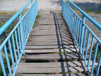 По покана на хората отидохме на място и на снимката показваме как изглежда мостът със сините метални парапети - отново изпочупени и изгнили дъски, по които е опасно да се преминава, стърчащи пирони и зеещи дупки.