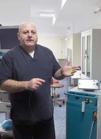 - Основното приложение на лазерите в урологията към момента е лазерното разбиване на камъни в пикочните пътища (лазерна литотрипсия). Използваме пулсов холмиев лазер, който е високоефективен. Няма място и конкремент (камък), до които да не можем да достигнем при нормална анатомия. Практически няма конкремент, независимо от твърдостта му, който да не може да бъде разбит. Методът е минимално инвазивен през естествен отвор - външния отвор на пикочния канал.