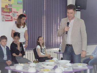 Пред малките ученици Костадин Филипов говори и по темата, по която работи в момента - здравословното хранене. Той направи салата от царевица, краставици и риба тон, за да демонстрира полезните за организма съставки и препоръча на децата да избягват преработени храни като чипс, кренвирши и майонеза.