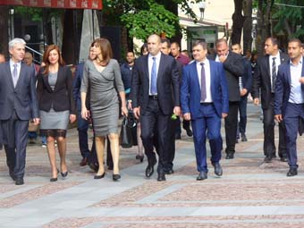 Пред общината поздравите и снимките продължиха, а президентът Румен Радев застана пред камерите на националните телевизии. Той коментира скандала “ЦУМ гейт”, като заяви, че споделя тревогата на председателя на Върховния административен съд Лозан Панов за състоянието на съдебната система. В същото време е изненадан, че съдия № 1 го призовава да създаде комисия по случая, което е в разрез с конституционните правомощия на президента. “Дневният ред на България не са крамолите във Висшия съдебен съвет”, категорично заяви президентът. Той съобщи, че на 30 май 2017 г. за първи път ще свика Консултативния съвет по национална сигурност, като тема на срещата ще бъдат рисковете и заплахите за националната сигурност. Румен Радев изрази и позицията си, че не президентът е институцията, която трябва да направи районирането за бъдещи мажоритарни избори.