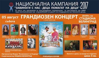 На 5 август 2017 г. на стадиона във Велинград ще се състои голям концерт, който е част от националната благотворителна кампания “Завинаги с нас” в помощ на децата на служители на МВР, загинали или пострадали при изпълнение на служебния си дълг.