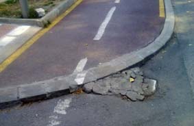 1. Велоалеята се пресича от 9 улици, което означaва, че 18 бордюра пречат на нормалното движиение. В началото не бяха направени плавни преходи и колоездачите бяха принудени да спират и слизат от колелата си или да намаляват скоростта и да се чудят как да преодолеят толкова често появяващите се препятствия и неравности. По-късно бяха поставени циментови връзки за премахване на неравностите. Няколко ммесеца по-късно обаче те се разпаднаха и разрушиха, като отново се появиха първоначалните високи краища на бордюрите.