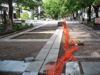 В участъка от сградите на общината до Чашата вече върви пълната подмяна на старата настилка с нова, като се спазва идеята да се ползват максимално естествени материали - мрамор и гранит. Поставят се нови гранитни плочи с размер 80/40/5 см (по проект дебелината на плочите е била 3 см, но по настояване на общината е увеличена за по-голяма здравина и издръжливост). Поставят се и червени риолитни павета с размер 10/10/10. В края на ремонта новата настилка ще се шлайфа, полира и фугира. В отсечката от чашата до ул. “Кирил и Методий” се поставят нови гранитни плочи и червени и сиви бетонови павета, такава ще е настилката и в бъдещата пешеходна зона от ул. “Юндола” до ДГС “Алабак”. Централният площад ще бъде на едно ниво, изцяло с настилка от мрамор и гранит. Ще се реномират и настилките към Пощата и в парка до Старата община. Искаме да изградим нещо трайно, което да служи за години напред, подчертава кметът.
