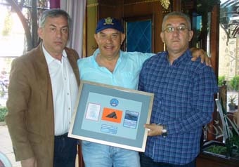 Златко Златанов с Йован Неделкович и ген. Станко Василевич, който му връчи необичаен и ценен дар: парче от сваления през 1999 г. в Сърбия невидим американски самолет Ф117А „Стелт“ (със сертификат за автентичност).