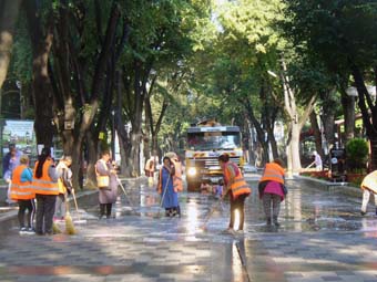 В петък паралелно с поставянето на последните павета и плочки се издигаше сцената. Продължи рязането на клони на дървета и почистването на централния парк. Садиха се храсти и брезички, правиха се проби на новия фонтан “Чашата”, демонтирано бе заведението “Тухлата”. Дни преди това от “ВКТВ” и “КМД” измиха готовите части от центъра - не само с вода, а и с препарати!