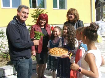 В слънчевия ден на двора във филиала на училището нашите скъпи гости бяха посрещнати с питка по стар български обичай и закичени със здравец от облечените в носии Александра Байлова, Виктория Карова, Илияна Белева и Рая Тодорова от 3 б клас. Съучениците им впечатлиха с подготвения рецитал на тема „Доброта“ и с последвалото музикално изпълнение на Павел Кънчев. Нашият дарител получи сувенири, изработени от децата, след което на всяко едно дете беше връчен подарък.