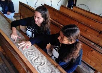 Следва посещение в училището на даскал Ботьо Пеков и вживяване в ролите на децата от взаимоучителното школо – писане върху пясък, на дъсчици с калем и с мастило и перо върху хартия ... М-мм, справиха се чудесно. И то без таблети и интерактивни чудесии... Много вълнения и, разбира се, снимки.