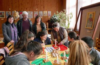 Тази година специален гост на ателието бе майсторката на писани яйца от Каменица Стойка Георгиева. Тя показа първите стъпки, които всяка година се правят за начало на изписването: след първия модел “Пеперудата” следва вторият – “Карамфила”.