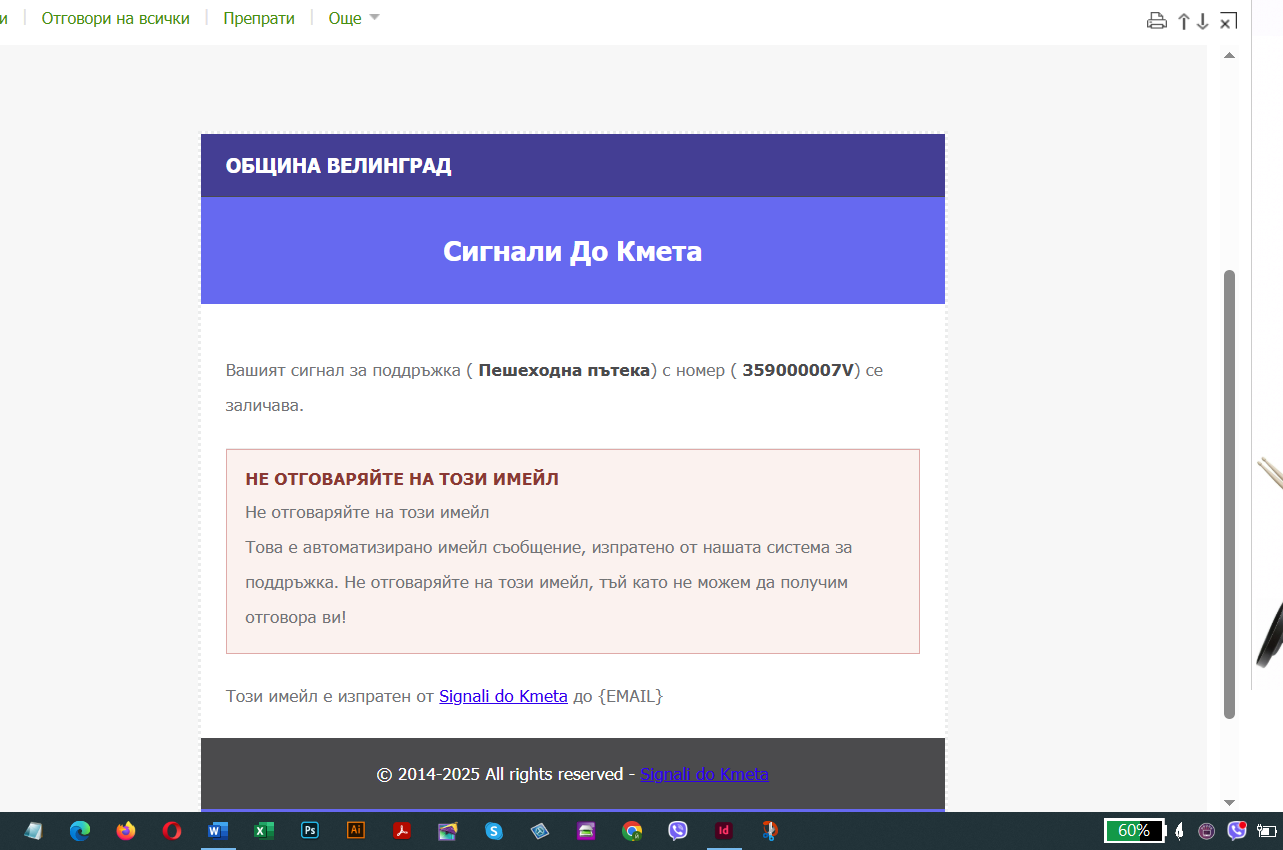 Месеци след подаване на сигнала през платформата гражданката получава обратна връзка, че сигналът е разпределен към конкретен служител в Общинска администрация с посочване на неговото име. Минават още месеци, но търпението й е възнаградено не с отговор или видим резултат, а с ново съобщение през платформата, което гласи: „Вашият сигнал за поддръжка (Пешеходна пътека) с номер ( 359000007V) се заличава.“