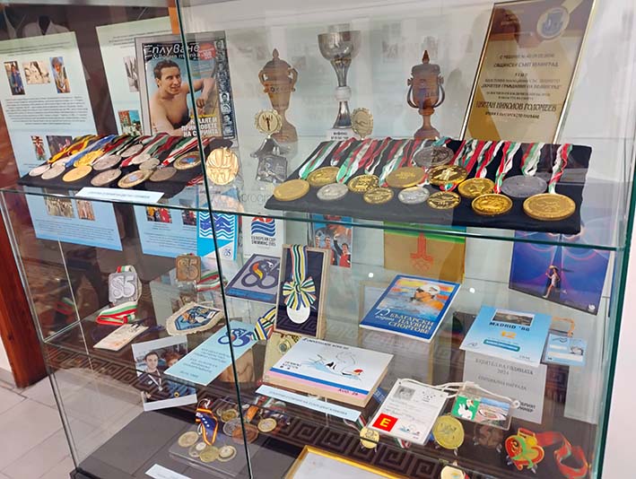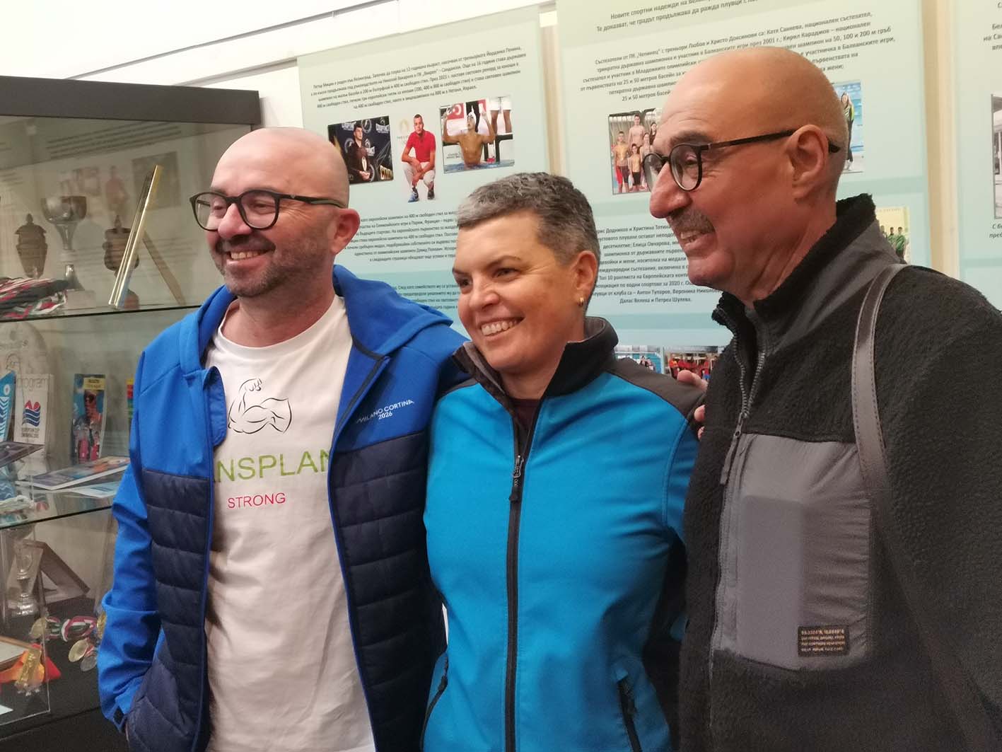 Своето достойно място в експозицията има и велинградската плувна школа, донесла толкова много спортна слава на нашия град. И тук началото е свързано с кмета Йосиф Шнитер и построяването на Централния минерален плаж, който днес заслужено носи неговото име. Плуването е дало на Велинград изключителни треньори начело с Антон Митров и изключителни състезатели като Цветан Голомеев, Соня Дангалакова, Вангелина Драганова, Петър Мицин и десетки други плувци от „Чепинец“ с дългогодишни треньори Любов и Христо Доксинови, „Белмекен“ с Росен Кривулев и Йорданка Христова и „Делфините“ с Моника Трифонова, за чиито постижения разказва изложбата. На откриването дойдоха ветеранът-шампион Петко Главинов и плувецът с кауза в подкрепа на трансплантациите Георги Пеев, които бяха аплодирани от залата. В отделна витрина са показани техни отличия, както и на братята Георги Николай Сейменови и на Петър Мицин.