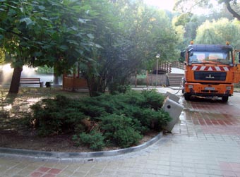 Тежка цистерна гази новите алеи с плочки в парка на Клептуза. Новите пейки, платени също с пари по проекта за парковете, се местят и вдигат. Дали някъде другаде по света и у нас поливат така градинките в XXI век?!