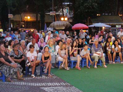 Белият екран на сцената на площад “Николай Гяуров” привлече вниманието на десетки хора вечерта на 9 август. Хубавите спомени за Лятното кино доведоха по-възрастните. Желанието да видят нещо различно от познатия екран на телевизора, компютъра или таблета доведе младите. Вместо със семки, както навремето, зрителите седнаха около сцената с пуканки в ръка и изгледаха новите български филми “Шопинг” и “Кецове”.