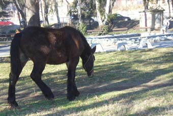 Дни преди Коледа кон пасе тревичка в парка пред Курортна поликлиника. Селска идилия или градски пейзаж? Още щрихи: зелената площ около коня е щедро наторена, а от паркиралите в парковата алея джипове (също неизменна част от “курортния” облик на СПА столицата) туристи се дивят и радват на гледката и я запечатват в снимки за спомен от Велинград. Стопанин или собственик на животното не се забелязва.
