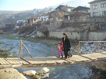 Много от присъстващите учители също споделиха мнение по ромските проблеми. Обща е позицията, че спешно трябва да се решат трите основни проблема на квартал Анезица: водата, пералнята и моста. За да отидат до града или на училище, живеещите в Анезица преминават през люлеещия се дървен мост, който виждате на снимката. Част от гредите липсват, защото след всеки ремонт някой ги открадва, за да си запали печката. И ако не се е изгради стабилен мост, то всички проекти за “ранна социализация и адаптация” на ромските деца просто ще потънат сред боклуците и водите на река Чепинска в района на Анезица.