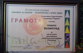 Община Велинград бе отличена с грамота за “Най-успешна целогодишна туристическа дестинация в България”, връчена от Регионалната туристическа асоциация “Родопи”. Това стана по време на XI Международно туристическо изложение “Планините на България - гостоприемство в четири сезона”, което се проведе от 15 до 18 октомври в курорта Пампорово. Официален гост на събитието бе заместник-министърът с ресор “Туризъм” в МИЕ Бранимир Ботев, който се включи във всички организирани дискусии по важни теми за бранша: резултатите от летния туристически сезон, новите акценти в политиката за подпомагане на българския туризъм, проблемите на районирането и др.<бр>