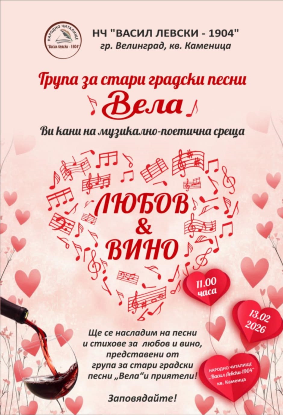 Читалището в кв. Каменица ще отбележи 14 февруари с музикално-поетична вечер, която ще съчетае празниците на виното и любовта.