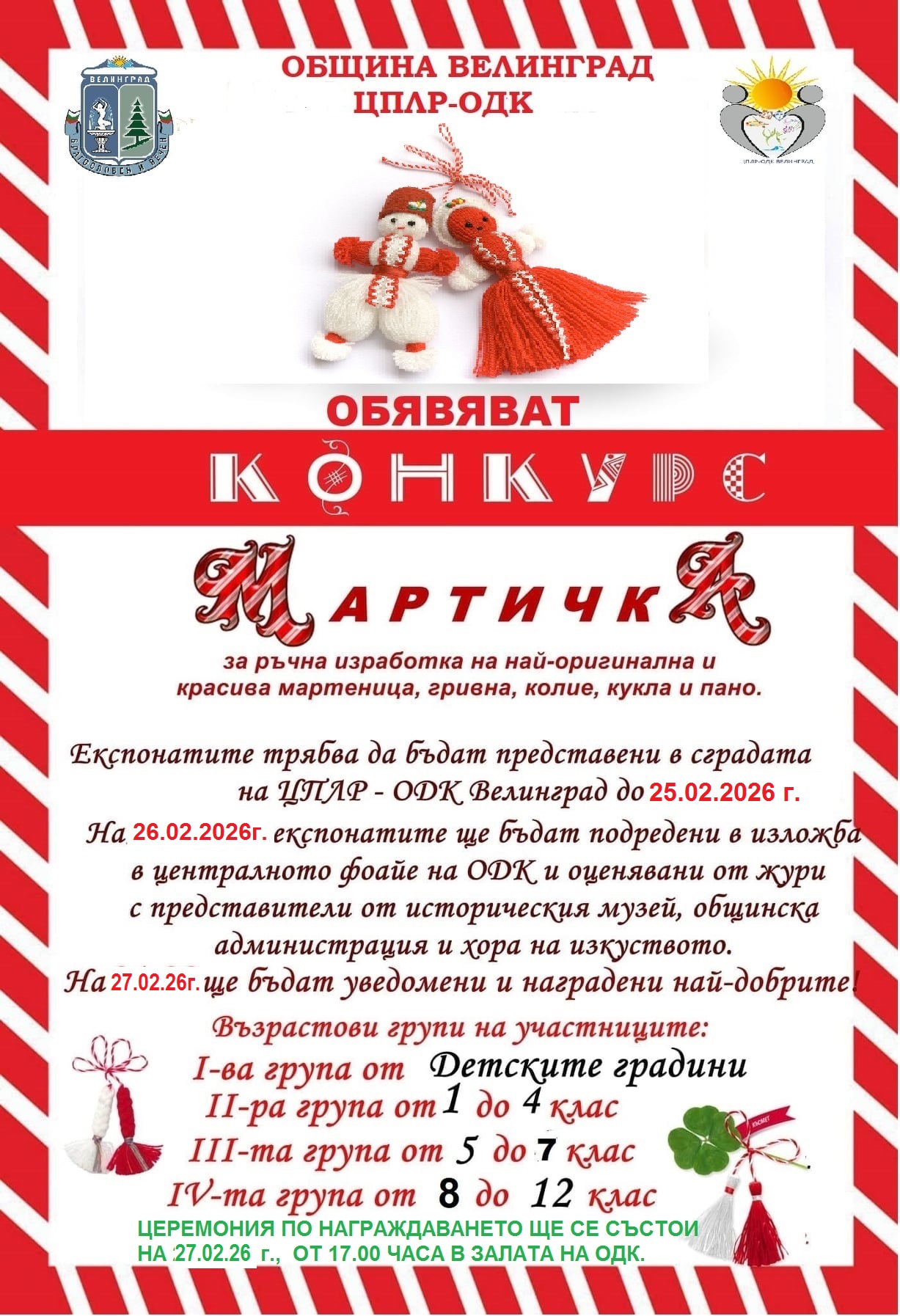 ЦПЛР-ОДК обяви своя традиционен конкурс „Мартичка“, който от години дава шанс на деца и ученици в община Велинград да покажат талант и креативност в изработване на традиционни мартеници, гривни, колиета, кукли и  картички, посветни на Баба Марта.