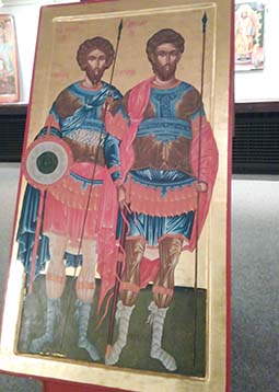 В експозицията са включени копия на средновековни и възрожденски икони. Централно място заема копието на Чудотворната икона на Света Богородица в сребърен обков от Бачковския манастир. Изключително интересна е рядко срещаната двулицева икона на Свети Наум и Свети Климент от XII век в Охрид. Уникална е и керамичната икона на Свети Теодор Стратилат от Велики Преслав, датирана IX – Х век. За първи път мнозина ще видят и коптска тъкана икона на Свети Георги, копие на изложената в музея „Пушкин“ в Москва от IV век. Включени са изображения на светците-воини: Георги, Димитър, Мина, Тодор Стратилат и Тодор Тирон, на цар Борис и цар Симеон, на ротондата "Свети Георги" - IV в. в София, "Златната църква" във Велики Преслав - Х в., и църквата "Свети Димитър" във Велико Търново - ХIV в., както и представители на керванджийската религиозна утвар и елементи от литургични облекла. Сред интересните експонати са фототипно издание на Библия Далматика от 1584 година и православен кръст – дърворезба от XIX век.