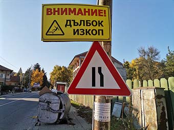 Живеещите на тази част от улица „Хан Аспарух“ не веднъж и два пъти са сигнализирали в общината. Притесненията на много от тях са свързани и с дълбокия изкоп за строеж на хотел в пространството между ул. „Юндола“ и парк Вельова баня. Единствената предприета мярка е поставянето на табелка с надпис „Опасен ров“, която обаче изобщо не решава проблема с пропадането на уличното платно. Част от него вече също е дълбок и опасен ров, който продължава да се разширява и да става все по-дълбок. Пропаднала е и част от тротоара, което застрашава съседната къща.
