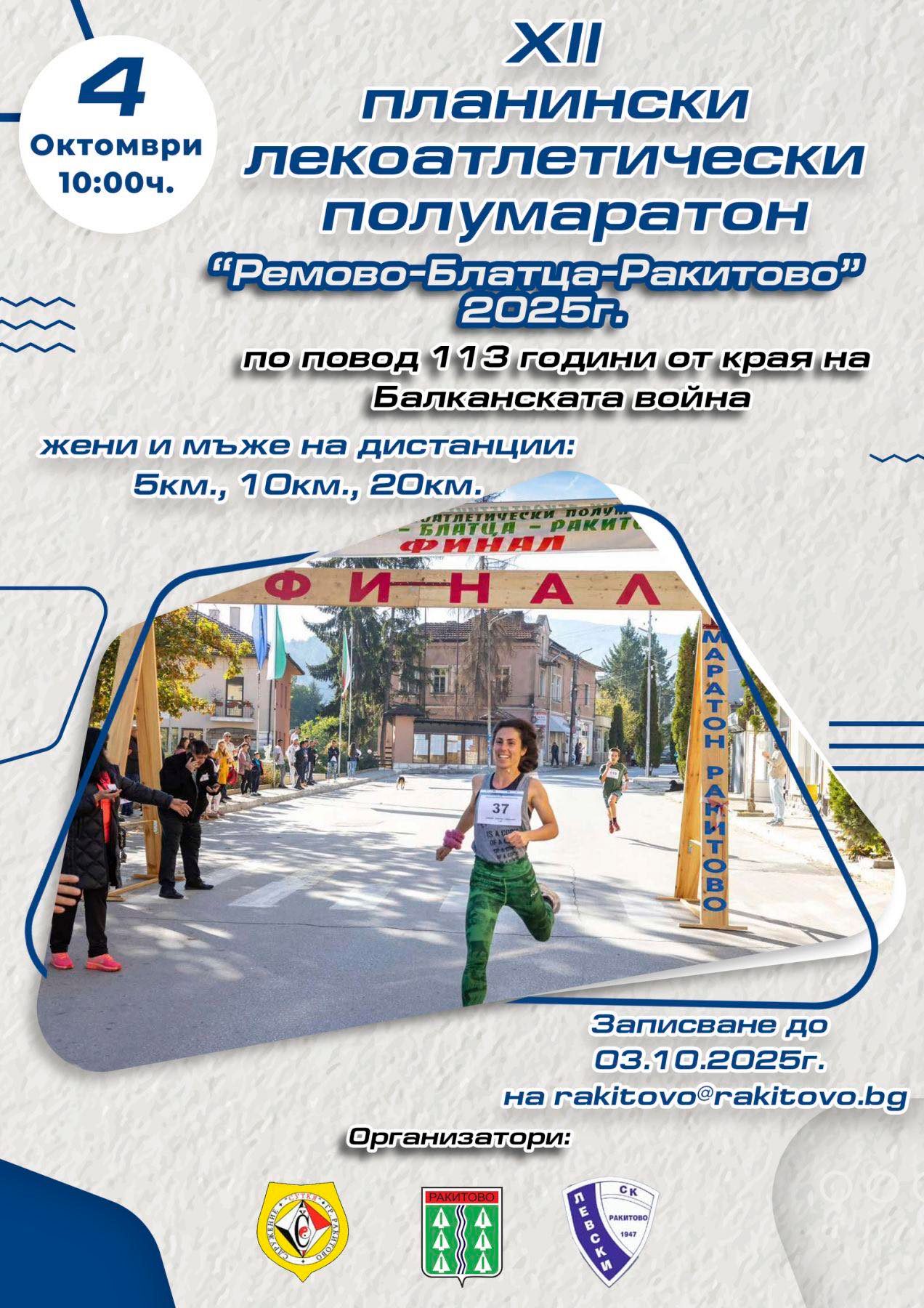 Дванадесетото издание на планинския лекоатлетически полумаратон „РЕМОВО – БЛАТЦА – РАКИТОВО 2025“ ще се проведе на 4 октомври 2025 г. Тази година организаторите Община Ракитово, сдружение „Сюткя” и Спортен клуб „Левски”, Ракитово са подготвили много изненади за участниците и гостите на спортното събитие.