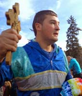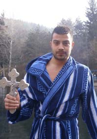 Шестима млади мъже също очакваха този момент, подгрявайки се с червено вино, за да се хвърлят в надпревара за изваждането на кръста. Отец Ангел освети водата за Богоявление и след благопожелания хвърли разпятието във водите на езерото.