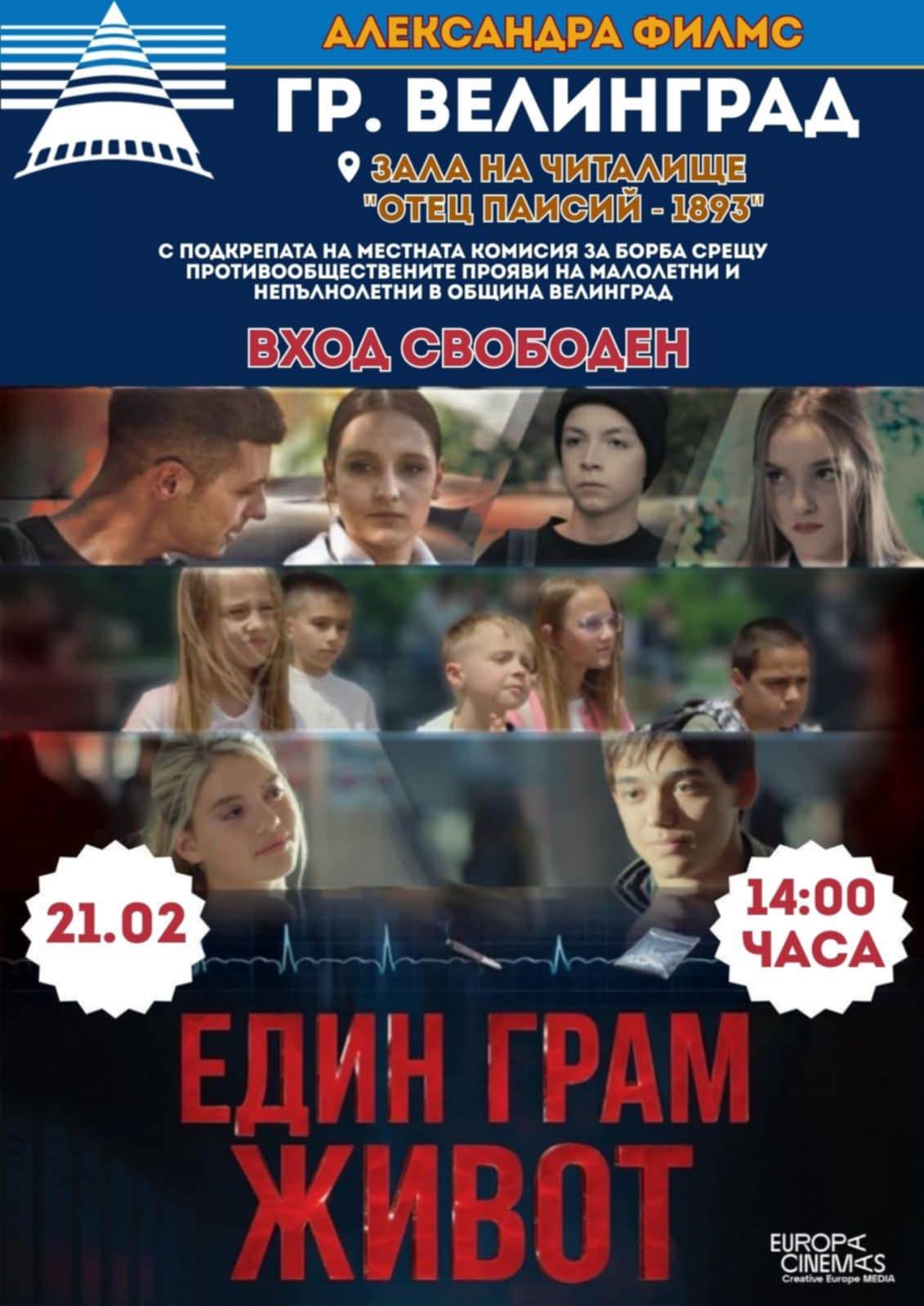 Местната комисия за борба срещу противообществените прояви на малолетните и непълнолетните (МКБППМН) към Община Велинград организира прожекция на филма „Един грам живот“.