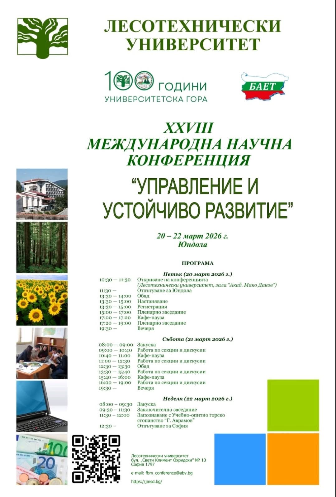 В периода 20–22 март 2026 г. в Учебно опитно горско стопанство „Георги Аврамов”, м. Юндола, на Лесотехническия университет ще се проведе XXVIII-та Международна научна конференция „...