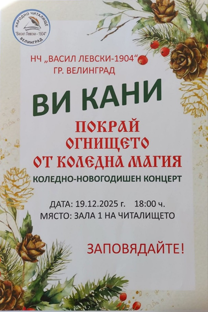 НЧ „Васил Левски-1904“ – гр. Велинград приключва 2025 г. с традиционния си Коледен концерт на 19 декември и коледарите, които на 25 декември отново ще пеят и наричат за добро, радост и късмет.